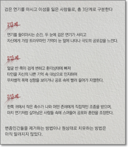 싱크홀의 검은 연기를 들이마시면 3단계를 거쳐 변종인간이 되는데 변해버린 변종인간을 원상태로 돌리는 방법을 찾는 것이 관건입니다.