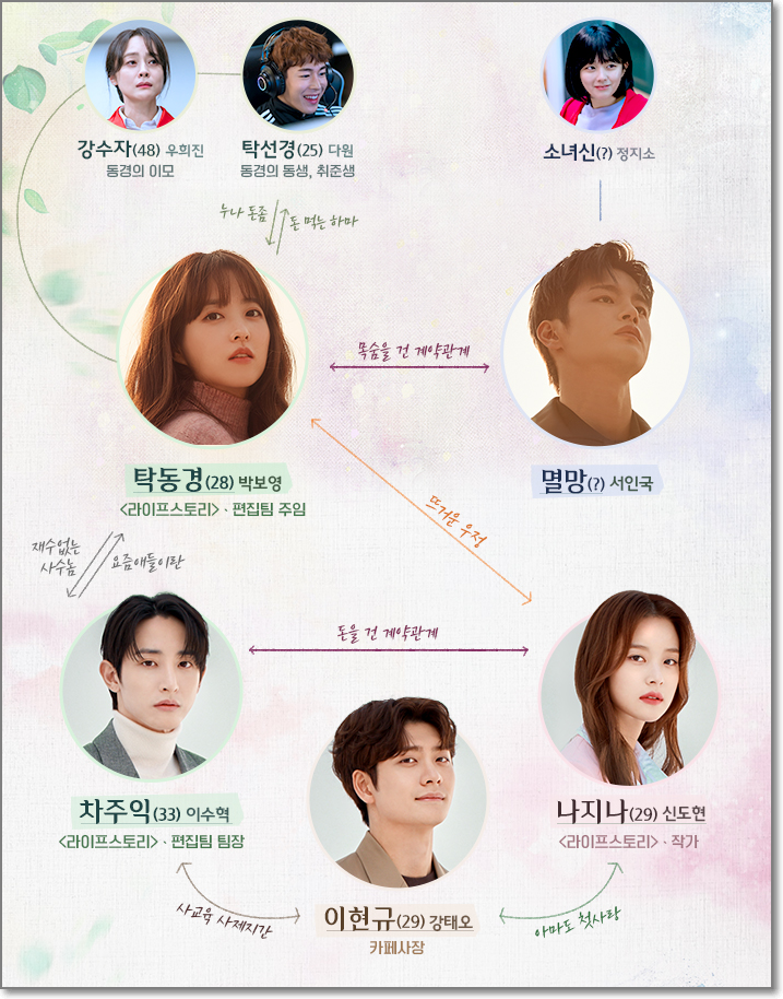 박보영은 드라마 속에서 어느 날 갑자기 시한부 선고를 받게 된 인간 탁동경으로 나오며, 서인국은 사라지는 모든 것들의 이유가 되는 특별한 존재 멸망 역으로 나옵니다.
