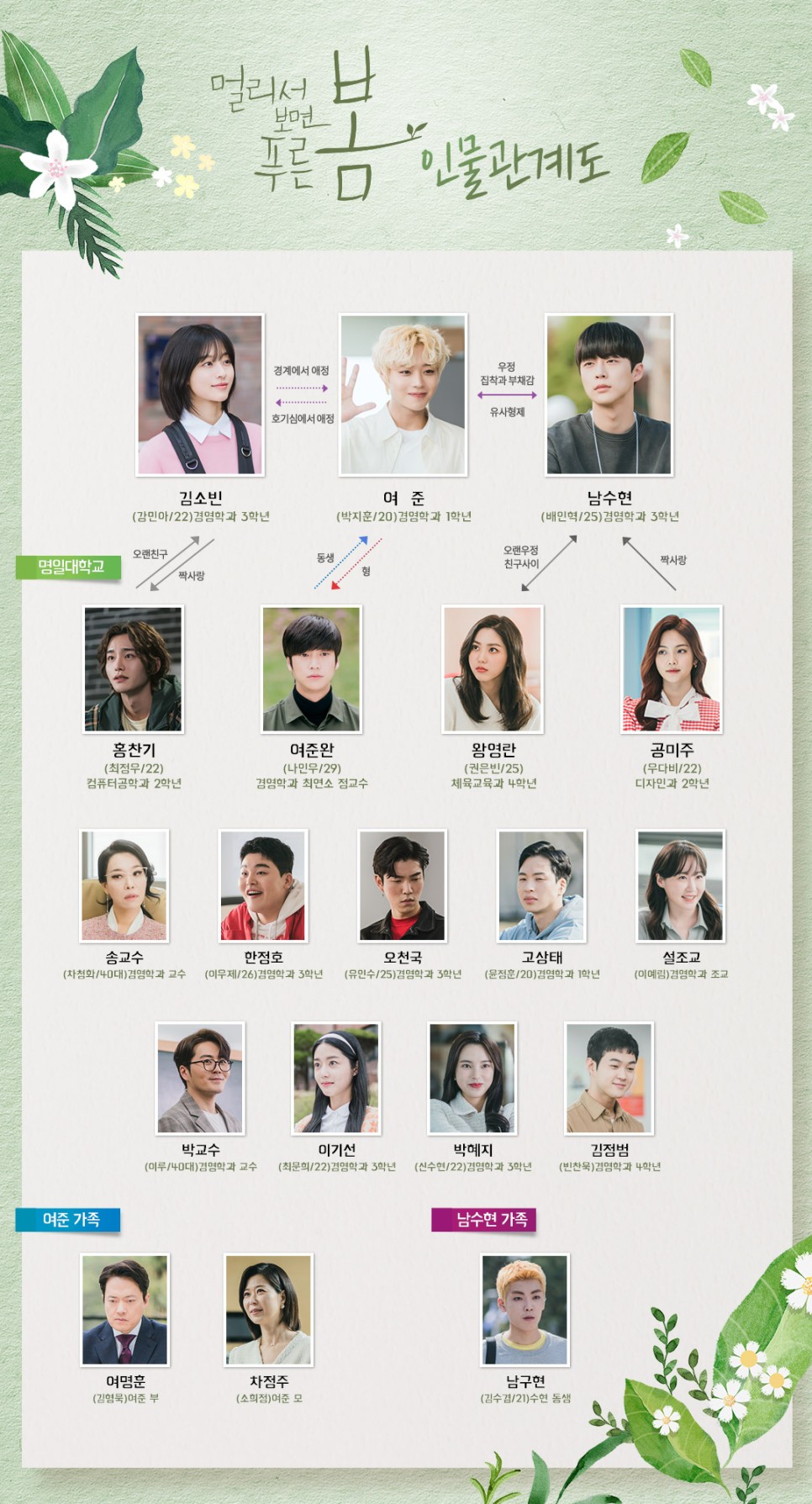 14일 첫 방송 되는 KBS 2TV 새 월화드라마 '멀리서 보면 푸른 봄'(고연수 극본, 김정현 연출)은 멀리서 보아야 봄인, 가까이서 보면 다른 그들의 청춘 이야기다. 캠퍼스 내에서 다채로운 인연을 맺어갈 박지훈(여준 역), 강민아(김소빈 역), 배인혁(남수현 역)의 관계가 첫 방송부터 관심을 끌 예정이다.