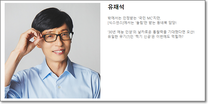 '식스센스2'는 이색적인 주제의 장소나 인물들을 찾아 다니며 오감을 뛰어넘은 육감을 발휘해 진짜 속에서 가짜를 찾아내는 예능 프로그램이다. 앞서 유재석, 오나라, 전소민, 제시, 미주에 이어 이상엽이 새롭게 고정으로 합류한 가운데 하석진과 2PM 준호, EXO(엑소) 카이 등 화려한 게스트 라인업까지 더해진다.