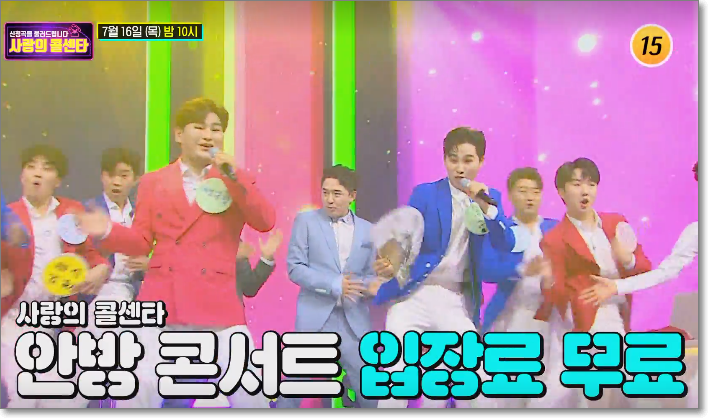 사랑의 콜센타 안방 콘서트는 입장료가 무료이며 오직 박수만 받습니다. 류지광 강태관 나태주 노지훈 김중연 황윤성 남승민으로 구성된 콘7이 사랑의 콜센타 TOP7과 함께 여름 특집 3탄 환상의 트롯 짝꿍 특집에 나섭니다.