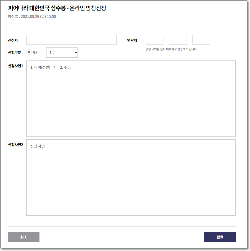 ※ 8월 29일(일) 녹화 외 사전 접속 테스트 및 이용에 대한 사전교육이 있을 예정이오니 참고 바랍니다. (당첨자에 한 해 추후 일정 안내)