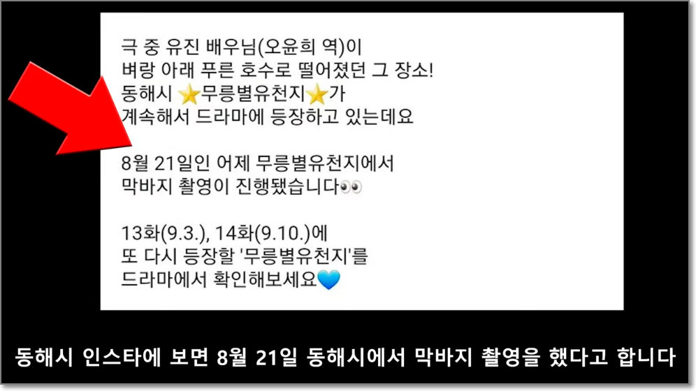 공개된 영상 속에서는 "오윤희가 절벽에 떨어지는 씬을 찍은 장소가 무릉별유천지다. 동해시 인스타에 보면 8월 21일 동해시에서 막바지 촬영을 했다 이 촬영씬은 13화, 14화에 나올 예정이라고 한다"는 추측이 이어졌다.