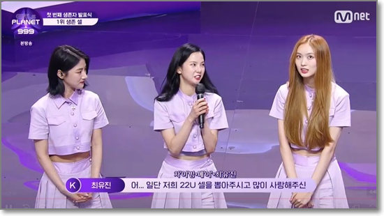 이날 1위 셀은 '22U 셀'의 차이빙, 최유진, 메이였습니다. 최유진은 "뽑아주시고 많이 뽑아주시고 사랑해주신 플래닛 가디언 여러분 정말 감사드린다"고 소감을 전했다.