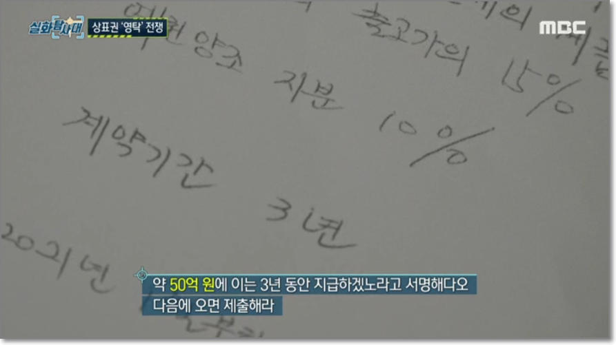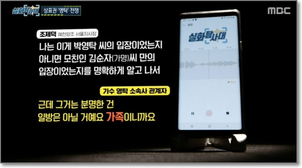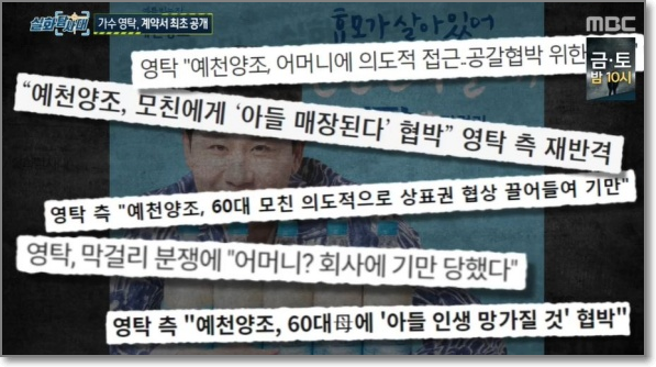 25일 방송된 MBC 시사·교양 프로그램 ‘실화탐사대’에서는 상표권을 두고 영탁과 예천양조 측의 갈등이 그려졌다.