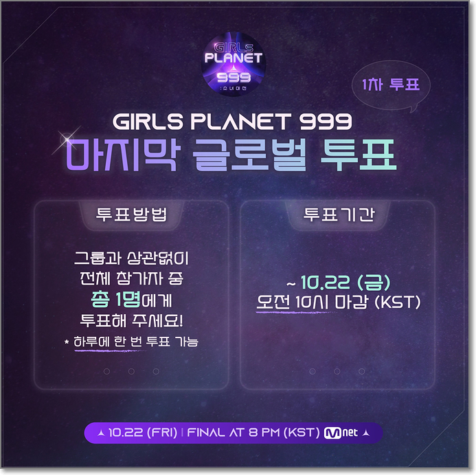 걸스플래닛999는 현재 최종 글로벌 1차 투표를 실시 중으로 10월 22일 오전 10시 마감되고 최종회 생방송(22일 20시~)에서 2차 투표가 이루어집니다.