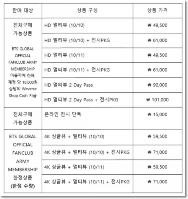 콘서트 가격은 49500원이며 고해상도 싱글뷰와 멀티뷰의 경우 59500원입니다. 아래를 참고하세요.