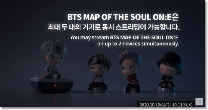 방탄소년단은 10월 10일 오후 7시와 11일 오후 4시 양일간 서울에서 열리는 온라인 콘서트 ‘BTS 맵 오브 더 소울 원’을 라이브 스트리밍으로 생중계합니다