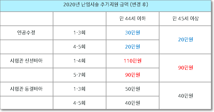 또한 만 45세 이상이거나 추가된 시술차수일 경우 (인공수정 4,5회 / 시험관 시술 5, 6, 7회) 추가지원 금액도 인공수정은 20만원으로 하향 조정은 물론 시험관 시술의 지원금액은 최대 90만원 으로 역시 대폭 상향이 되었습니다.