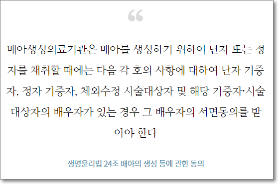 미혼 여성이 정자은행을 이용하는 것은 불법입니다. 한국에서는 결혼한 사람만 시험관 시술이 가능한데요. 난자나 정자를 기증하거나 체외수정(시험관) 시술을 받을 때 모두 배우자의 서면 동의를 받아야 합니다.