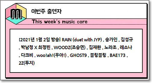 2021년 새해 첫 mbc 쇼 음악중심이 시작합니다. 2021년 첫 방송인데요. 새로운 마음으로 멋진 무대를 선보일 가수들이 누구일지 궁금합니다. 라인업 및 자세한 시청 방법 안내드립니다.