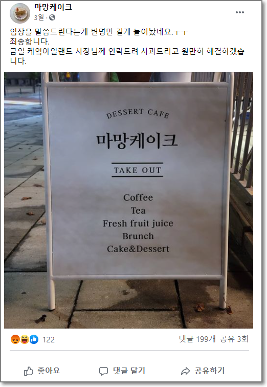 그런데 마망 케이크 점주는 케잌 아일랜드 케이크 종류와 모양을 흡사하게 한 것은 맞고 알리지 않은 것은 실수라며 카페를 개업하려고 나온 건 절대 아니라고 했는데요. 급하게 카페를 개업하게 되면서 익숙한 것에 영향을 받았다고 변명을 했습니다.