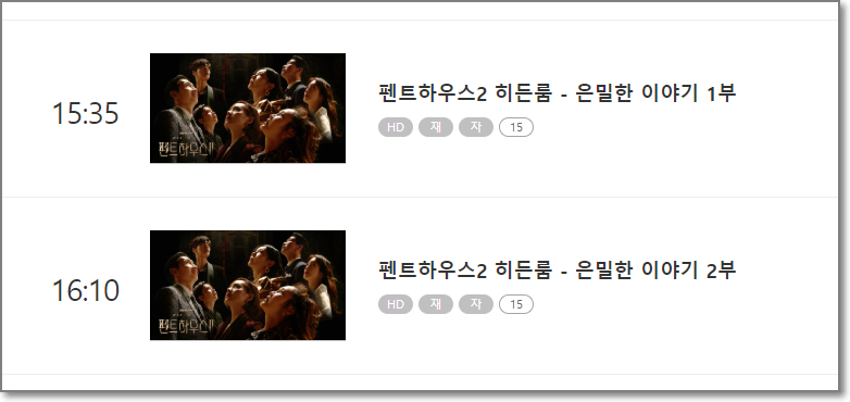 재방송 시간에 보기 힘들경우 다시보기를 하면 됩니다. 펜트하우스2 홈페이지에 접속하여 시청 가능하며 유료 결제가 필요합니다.